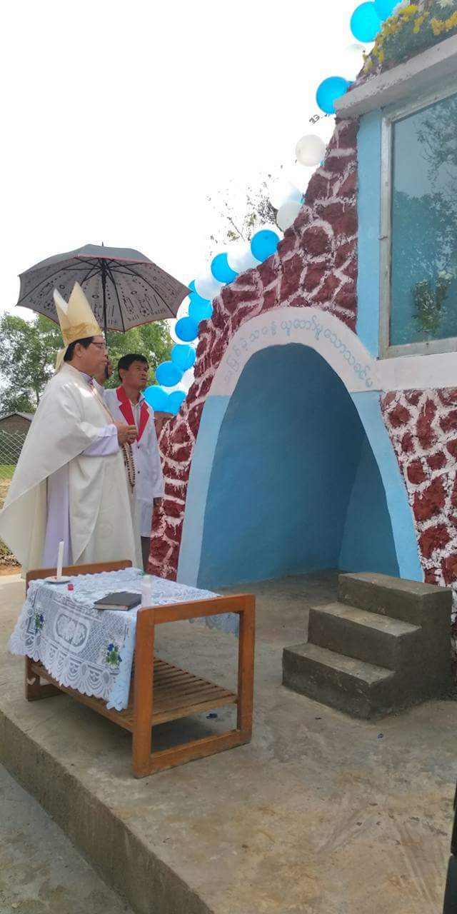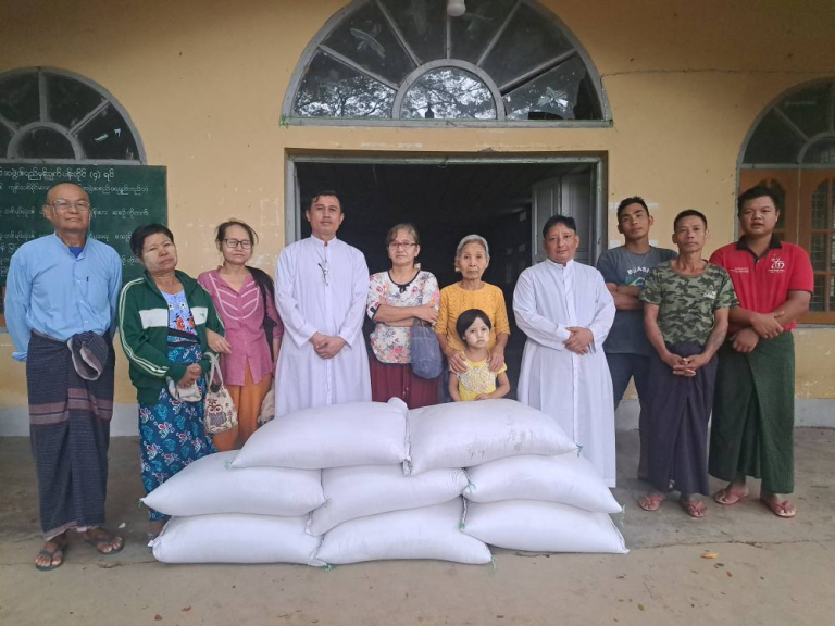 ယနေ့နံနက်တွင်လည်း ဓမ္ဘီမြို့၊ Fr. Francis Min Min Htun တာဝန်ကျရာ ကျောင်းဝင်း ၌ စားဝတ်နေရေးမပြေလည်သော အိမ်ထောင်စုများ မိသားစု ၁၀ အိမ်အတွက် ဆန်များ ဝေခဲ့ပါသည်